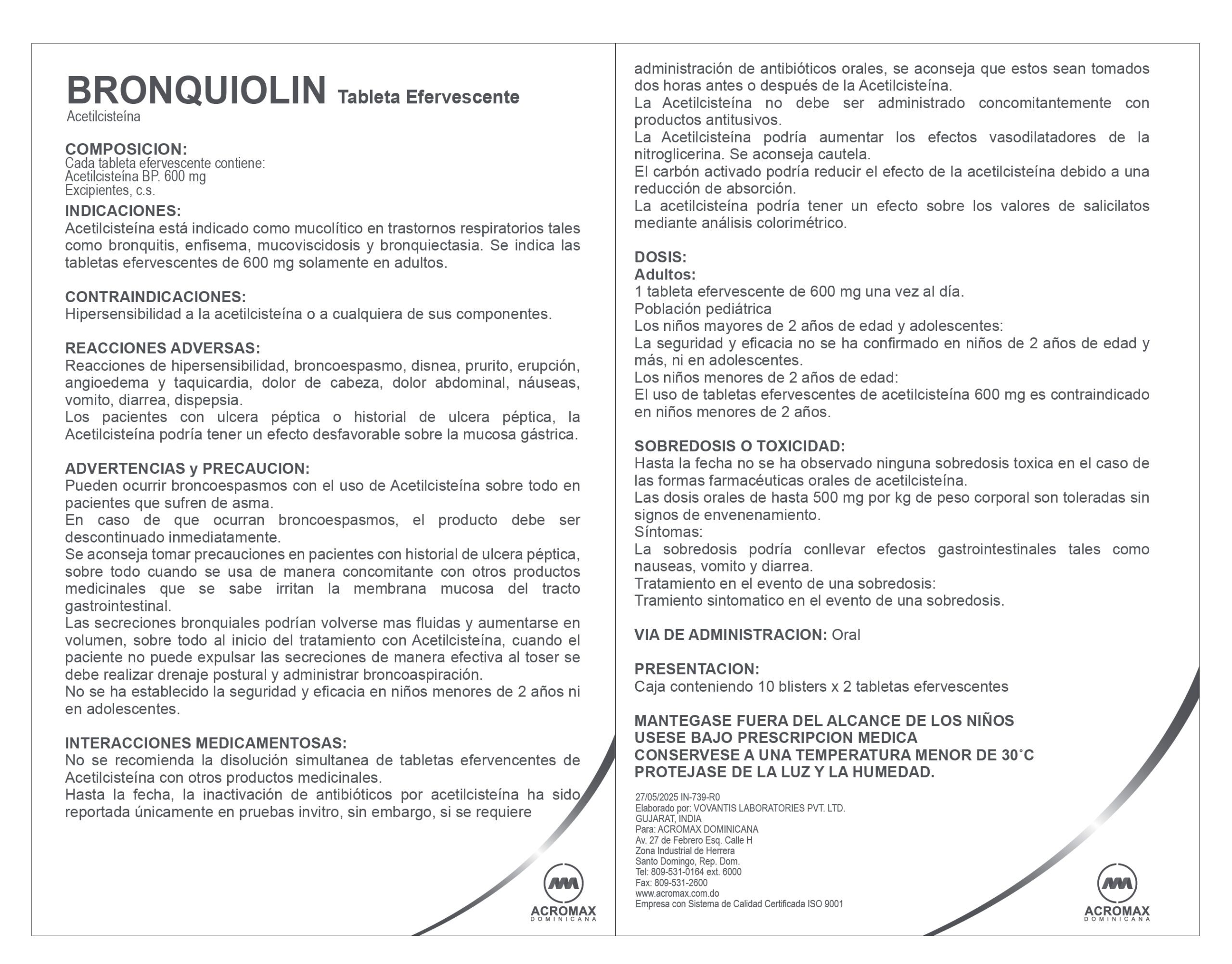 Composición: Cada tableta efervescente contiene: Acetilcisteína BP. 600 mg